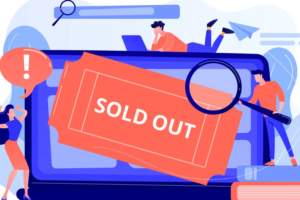 Popular show, best concerts and music festivals searching. Online booking system. Sold-out event, sold-out crowd, no tickets available concept. Pink coral blue vector isolated illustration